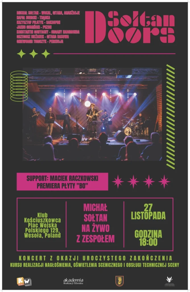 Zapraszamy Cię na niezapomniane doświadczenie muzyczne! 27 listopada w Klubie Kościuszkovca odbędzie się koncert zespołu Soltan Doors, który będzie nie tylko artystycznym widowiskiem, ale także celebracją ukończenia zaawansowanego kursu realizacji nagłośnienia, oświetlenia scenicznego i obsługi technicznej sceny.